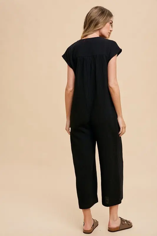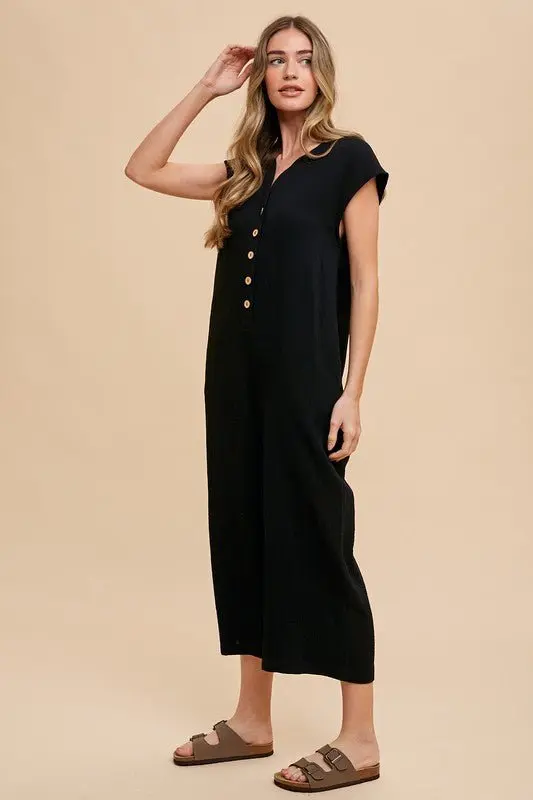 The Button Detail Wide Leg Jumpsuit with Pockets is a chic and versatile garment, featuring button detailing and a trendy wide-leg silhouette for a chic and flattering look.
